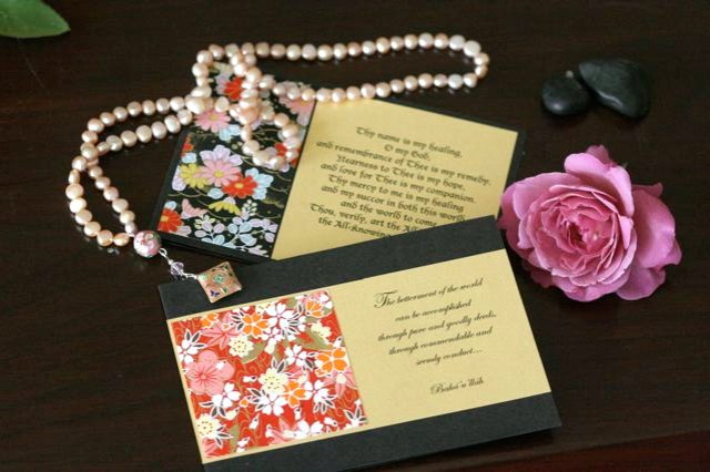 In addition to the exquisite music Elika creates, she is also a talented artist and craft person. Like her music, her art is designed to uplift the spirit. Among Elika’s latest projects are prayer beads from Chinese water pearls, hand made specialty cards using Japanese paper and quotations from the Writings of Baha’u’llah, silk prayer book covers, and more – all of which can be seen on the “Beautiful Items” page of her website. The music and art of Elika Mahony is her gift to humanity and a testament to deep spirituality of this gifted artist.