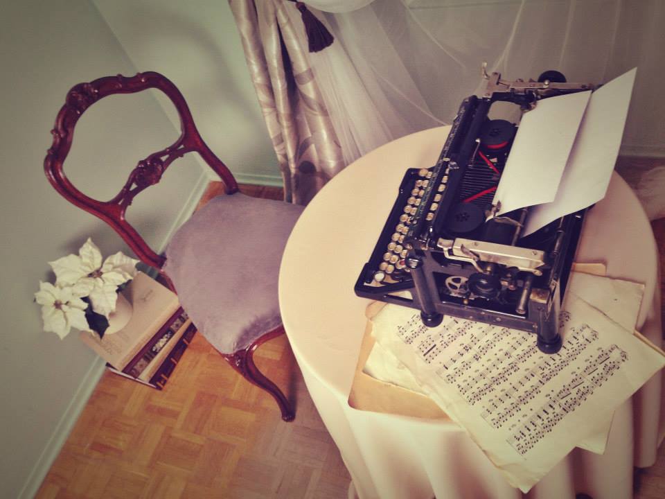 pass to the next one. Having a huge inspiration from early 20th century (French “Belle Epoque”) I was looking to create a romantic environment. Creating songs is a personal intimate moment and not really well associated to our era of music writing using computers and various electronic gadgets in the process of creation. I’ve spent about month to find appropriate decorations for this video: dress, curtains, jewelry, feather, inks and all other decorations. For example the chair used was bought and completely restored to correspond the piano’s style. I also bought the typewriter – nearly 100 years old (working perfectly by the way).”